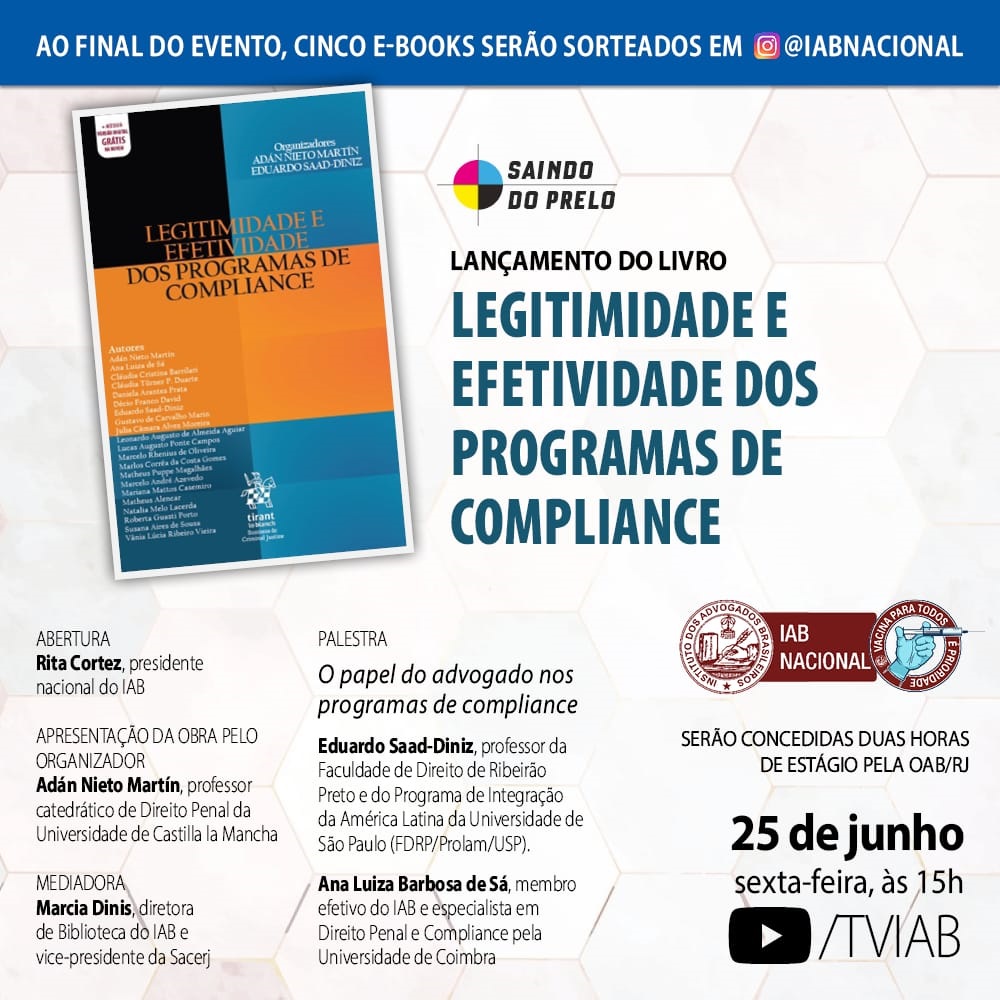 A obra coletiva foi organizada pelo professor catedrático de Direito Penal da Universidade de Castilla la Mancha (da Espanha) Adán Nieto Martín, e pelo professor do Programa de Integração da América Latina da Universidade de São Paulo (USP) Eduardo Saad-Diniz. No perfil do IAB no Instagram, é possível participar do sorteio de cinco e-books.
