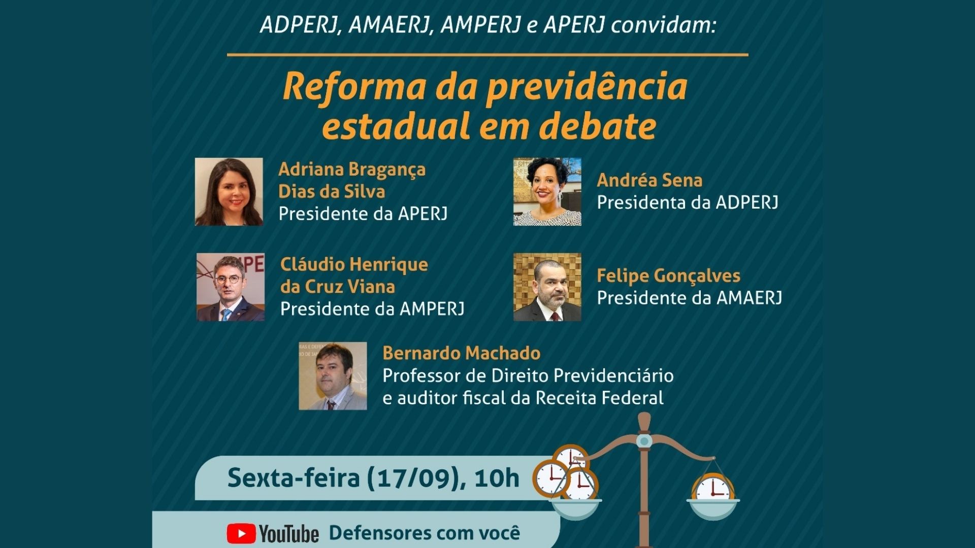 A Amperj, em parceria com as associações de carreiras jurídicas do Estado, Adperj, Aperj e Amaerj, promove nesta sexta-feira (17), às 10h, a palestra virtual “Reforma da Previdência Estadual em debate”, para tratar dos impactos do novo Regime de Recuperação Fiscal (RRF) para a Previdência dos integr...