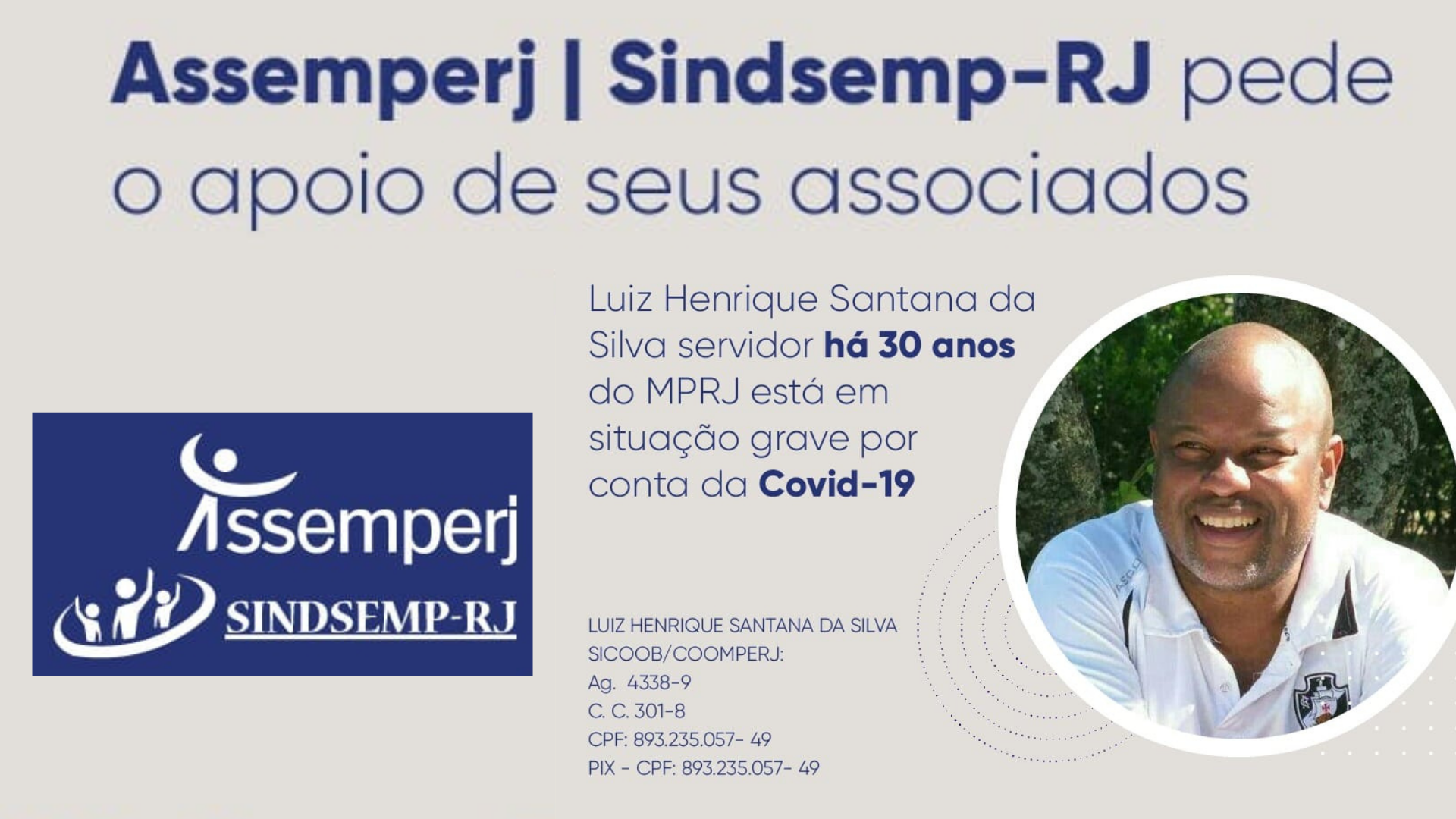 A Amperj se soma à campanha da Assemperj (Associação dos Servidores do MPRJ) para ajudar a família do servidor do MPRJ Luiz Henrique Santana da Silva a custear seu tratamento para a Covid-19. No MPRJ há 30 anos, ele está em terapia intensiva. Como o quadro é grave, a família precisou contratar u...